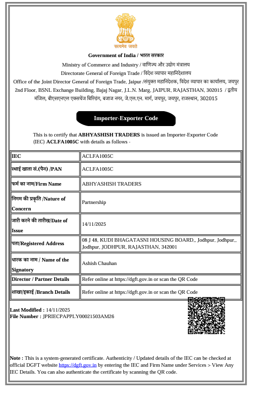 Unlock PossibilitiesWelcome to Abhyashish TradersYour trusted global partner for premium carpets, quality food items, exquisite handicrafts, rare antiques, and authentic coins. Preserving heritage, empowering artisans. Explore Products Contact US Our ServicesDiscover our comprehensive range of premium products, each carefully selected and crafted to meet the highest standards of quality and authenticity. Premium Carpets & RugsPremium Carpets & RugsHand-knotted, hand-tufted, and flat-weave carpets crafted by skilled artisans. Read More Quality Food ItemsOrganic onion powder, premium makhana, and other food products. Read More Home Décor & HandicraftsBeautiful furniture, decorative items, fine art, and collectibles. Read More Antiques CollectionRare maps, manuscripts, flambeau antiques, and historical artifacts. Read More Coins & CurrencyAuthentic rare and antique coins from family heritage collection Read More Experience & ExcellenceTrusted by customers worldwide for our commitment to quality and heritage preservation +Happy Customers +Years Experience %Quality Assurance Certificates Timeless Carpets & Antiques, Modern Living ★★★★★ Managing Director Yash Dadhich ★★★★★ Marketing Director Ashish Chauhan ★★★★★ Technical Director Abhay Sharma What Our Customers Say ★★★★★ Exceptional service! This company goes above and beyond to meet their customers needs. I couldn’t be happier with the results.Gopal Goyal Outstanding quality and professionalism. have been a loyal customer for years and have never been disappointed.Taylor Johnson Reliable and trustworthy. I highly recommend this business to anyone looking for top-notch products/services.Casey Williams